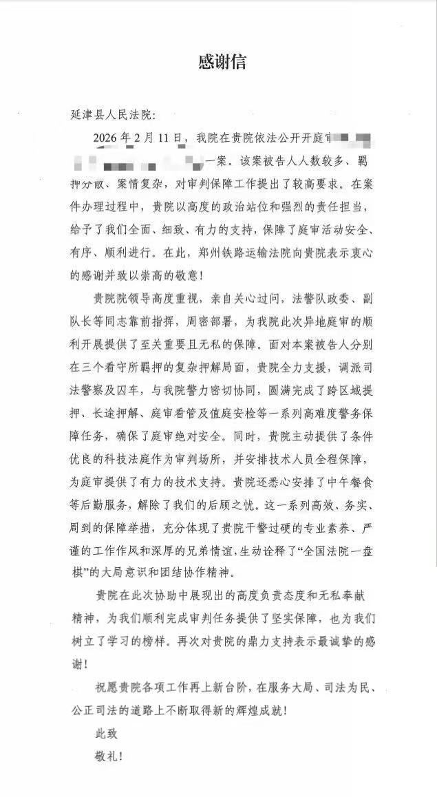 在此,郑州铁路运输法院谨向河南省高级人民法院法警总队的科学调度与坚强领导,向郑州铁路运输中级法院法警支队的全程指导与靠前支撑,向新乡市中级人民法院、延津县人民法院院领导及法警队的鼎力相助与无私支援,致以最诚挚的感谢!